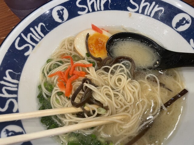 日曜、お昼、快晴。夏ではあるものの、やはりすごい列。1時間くらい並びました。ただ、日傘兼雨傘?を貸してくれるので助かりました。近くにファミマもあるため、途中で抜けて飲み物買ったりしました。店内通されると、壁一面に芸能人のサイン。お土産になってるだけありますね。ど有名なこちらのお店。1番人気の煮卵入りラーメンを麺硬めでお願いしました。あとは半焼き飯を頼みました。