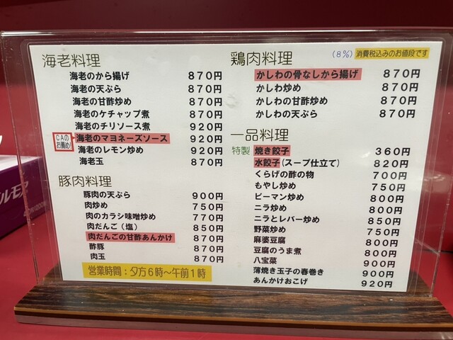 餃子は1人前だと7つ、でも小ぶりで女性でもペロリらしく、とさんと行っていたので2人前にしました。あとは気になっていた、かどや丼と、えびまよ!かどや丼は、白ごはんの上に、麻婆豆腐の豆腐なしにネギが入ってる醤油が効いた味の餡がかかってます。これむっちゃくちゃ美味しかった、、全然1人で食べれる量でした。あとエビマヨ!!!エビがぷりぷりでどうこうというよりは、マヨダレが美味しすぎて感動しました。餃子も小ぶりでジューシーでパリパリでにんにくもきいててパクパクいけます。からあげとかやきめしも頼んだんですけど、ダントツでかどや丼とエビマヨが美味しかった!これは絶対頼むべき!!!むちゃくちゃ美味しかったです!絶対またいきます!