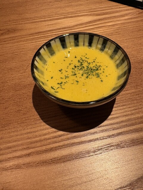 まずお通しにかぼちゃのスープ!外が寒いからあったかいお通しだそうです^_^優しさ半端ない笑