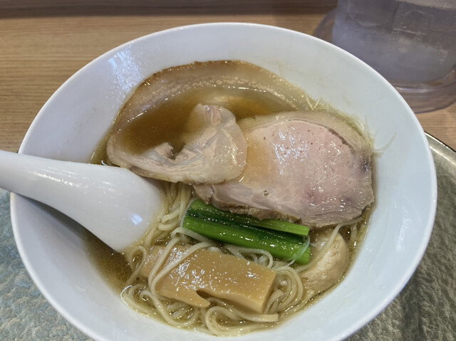 平日に訪問。ピーク過ぎで、行列は5人くらいだが流れは絶えず。食べログ評価が3.98の人気店。評価などは流動的ですが、2023年4月時点で食べログランキング全国3位みたいです。土日、祝日が定休日、車で向かう必要がありそうなので訪問難易度が高いお店です。基本メニューは4種類の醤油ラーメンを選べますが、今回は淡口しょうゆの「白出汁」にチャーシュー鷄1枚、豚3枚をオーダー。数種の厳選した鶏からの出汁。牡蠣、アサリなとの魚介出汁。ゴボウ、白菜などの野菜出を使用。醤油は長野県の淡口醤油を使用。材料と醤油にこだわりを持って調理されてるそうです。スープはビジュアルが綺麗で、鷄油が浮いてますがしつこくなく、淡く優しいスープです。出汁がバランスよく調合されていて美味しい。麺は柔らかめなストレート細麺で、スープに絡んで旨いです。チャーシューは「知床鷄もも」の鷄チャーシューに「もろみポーク」のバラ、ロース、肩ロースを選びましたが、特に「もろみポーク」のチャーシューがとてもジューシーで美味しいです。チャーシューも大きめで食べがいがありました。人生経験では5本指には入るラーメンのチャーシューの美味しさでした。とても美味しく、綺麗なラーメンでした。オススメです。