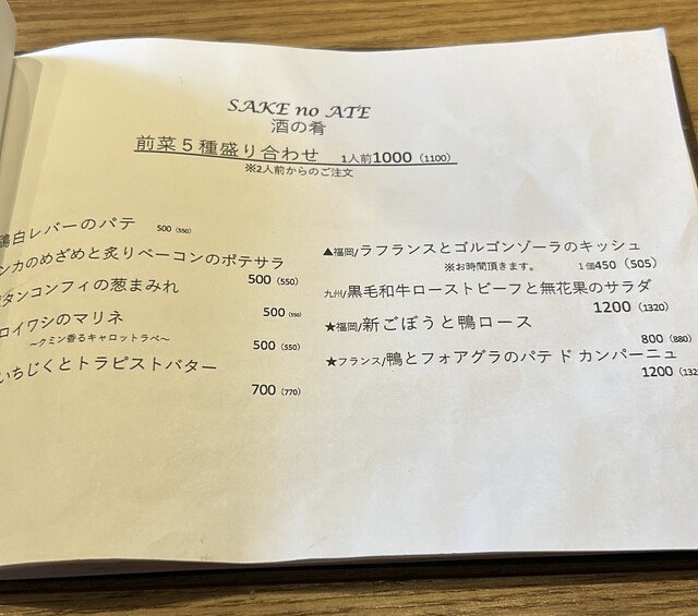 黒トリュフときのこのタルト、無花果バター、鴨とフォアグラのパテ・ド・カンパーニュ、ラ・フランス生ハム巻き、合鴨ロースト、鰯と人参のマリネ、冷製ポタージュ。どれをとっても味が良く趣向を凝らした品ばかり。予約した段階で前菜盛合せをお願いしていたがこれはマストだと思った。