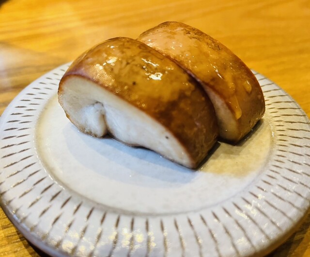 お通しは鯖の棒鮨 鯖の表面を香ばしく炙っていて中はレア。お米の硬さも丁度良く、昆布の佃煮が中に詰められている。