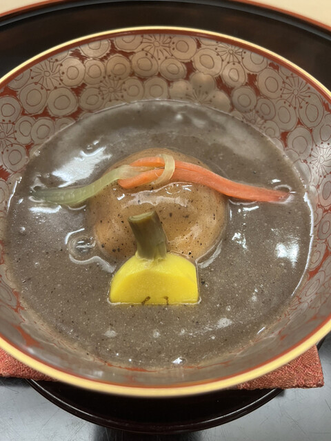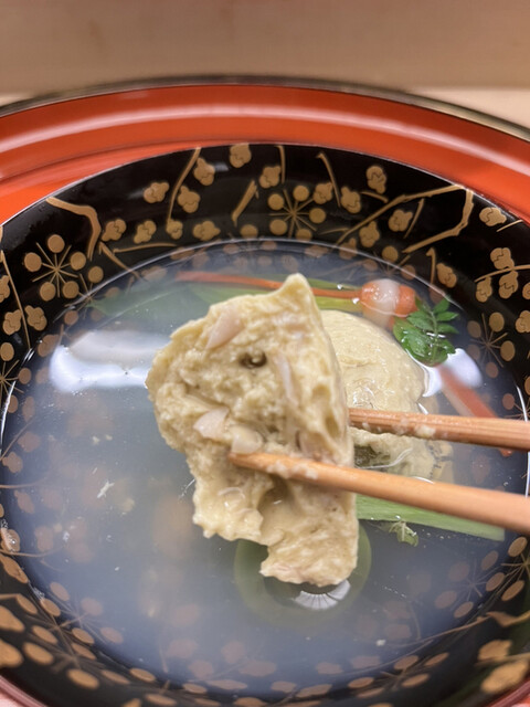昼懐石15730円。蛤真丈の椀。ふんわりとした口触りですが、刻んだ蛤とつぶ貝の食感もあり、貝を満喫できるお椀です(╹◡╹)(╹◡╹)