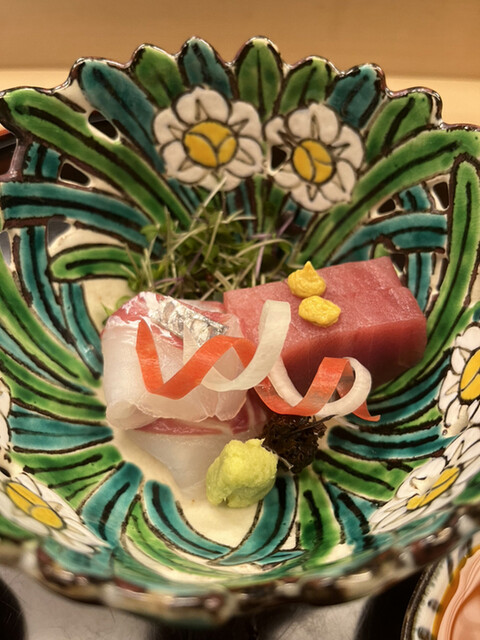 昼懐石15730円。明石天然鯛、鮪。マグロには火を入れた卵黄が挟まれていて、濃厚な仕上がりです。最近、こちらの鮪は実高く、鯛よりも楽しみかもしれません(╹◡╹)(╹◡╹)