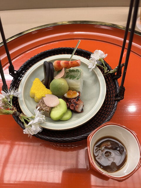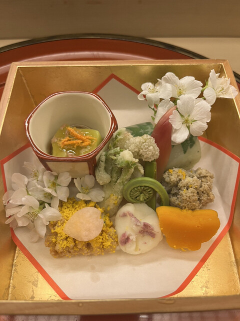昼懐石15730円。八寸。華やかな春らしい彩りです♩。鯛肝松風、鯛の木の芽寿司、桜煮のタコなど、旨味がギュッと詰まった一籠です(╹◡╹)(╹◡╹)