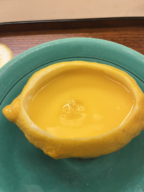 昼懐石15730円。杏仁豆腐 レモンガード。レモンの器で杏仁豆腐を仕込み、レモンを使ったソースをかけてあります。さっぱりと美味しいデザートです(^。^)