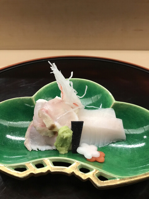 昼懐石15730円。てっさ。噛むほどに味の出る天然トラフグは、二段引きの包丁技も冴えています(╹◡╹)(╹◡╹)