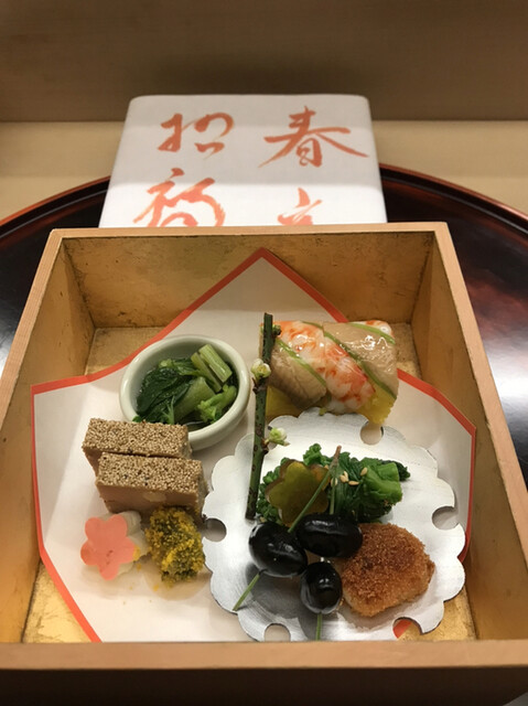 昼懐石15730円。花びら寿司、小川唐墨、菜種辛子和え、豆慈姑、千車唐味噌漬け、子持昆布、ごまめ、黒豆。菜種や千車唐のような素朴な材料も丁寧な調理で大ご馳走です(╹◡╹)(╹◡╹)