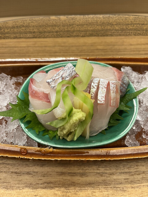 昼懐石13310円。明石天然鯛、縞鰺。ポン酢を固めたものでいただく縞鰺が、私の好みにピッタリです(╹◡╹)(╹◡╹)