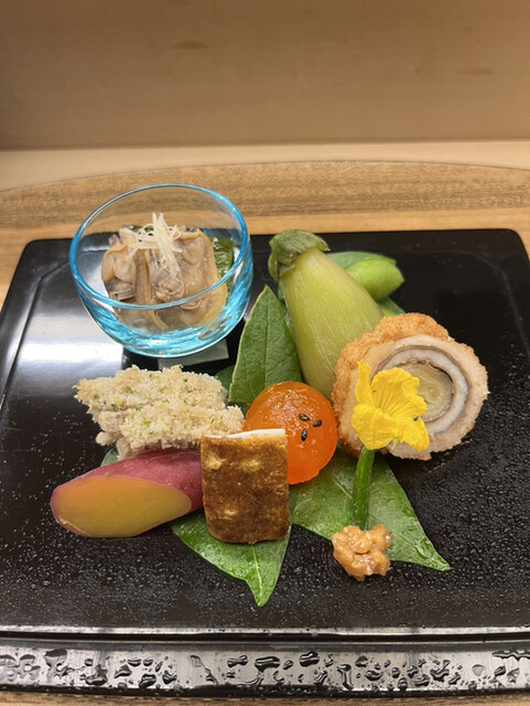 昼懐石15730円。八寸。辛子蓮根も大好物です。辛味の効いた本格的な味わいです(╹◡╹)(╹◡╹)。海鼠、豆腐味噌漬け、菜種など、バランスも素晴らしい八寸です(╹◡╹)(╹◡╹)