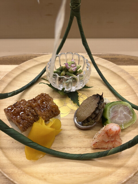 鱧寿司、サフラン生姜、鯛水玉胡瓜、花海老、胡麻酢和え、花穂山椒、鮑、蛸の子