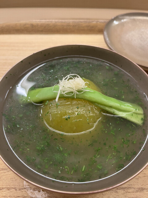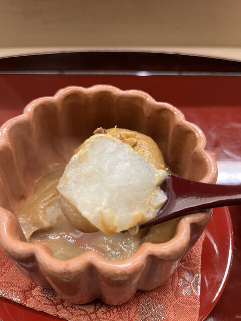 昼懐石15730円。小蕪風呂吹き 胡桃味噌。なめらかな小蕪はトロトロの熱々です。蕪を松茸や明石天然鯛に勝るご馳走に変身させる、魔法の火入れだと思います(╹◡╹)(╹◡╹)