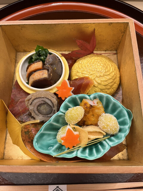 鮟肝、山葵菜、茸、唐墨、慈姑煎餅、海老共焼き、鱧八幡、紅葉烏賊、松葉素麺、粉吹き銀杏
