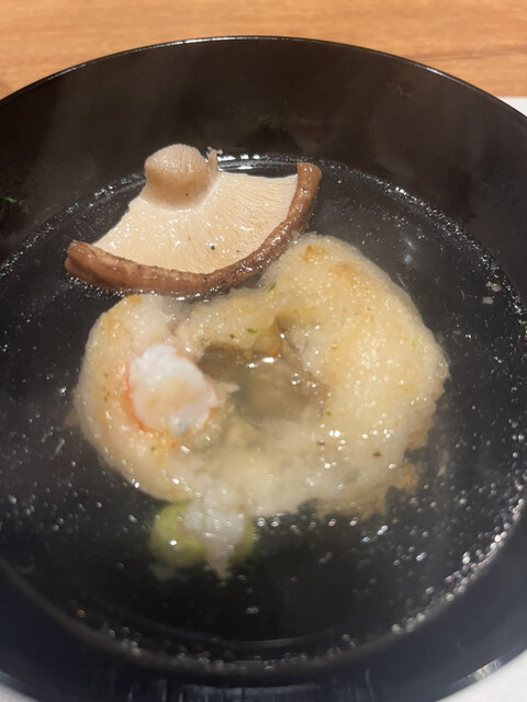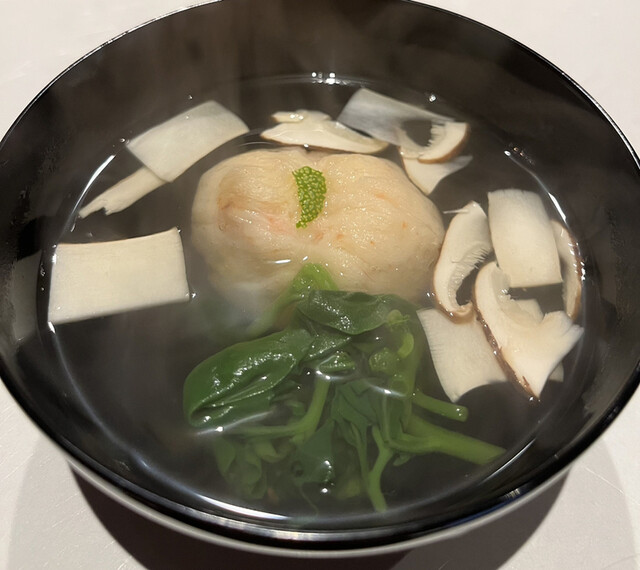 コース7700円。海老真丈の清汁。清汁、良き味わいです。繋ぎ多めでふわふわの真丈ですが、海老の旨味と食感も楽しめます。