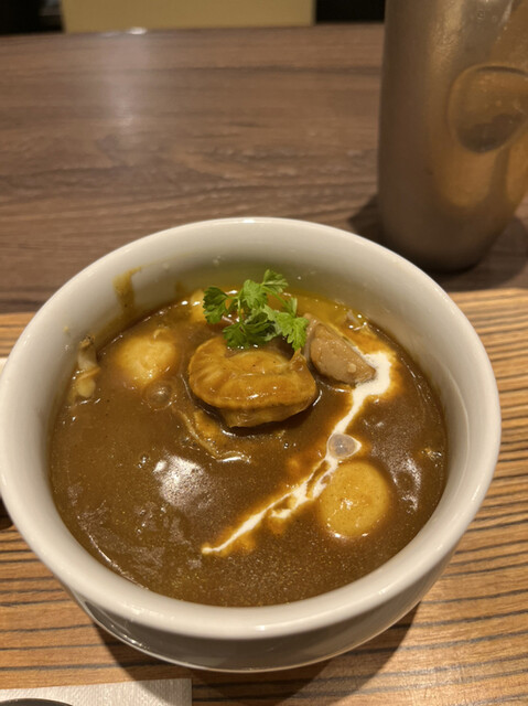シーフードカレー1800円。このコライユ付きのまま調理された帆立も、私にとっては嬉しい具材です。海老、浅利、マッシュルーム、うずらの卵も良い味わいです(╹◡╹)(╹◡╹)