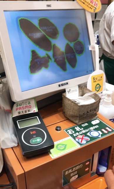 あっ、そう、そう。このハイテクレジ。トレーに乗ったパンかざすと一瞬でパンの形状読み取り、お会計。勿論会計はレジ前の挿入口に入れるだけ。