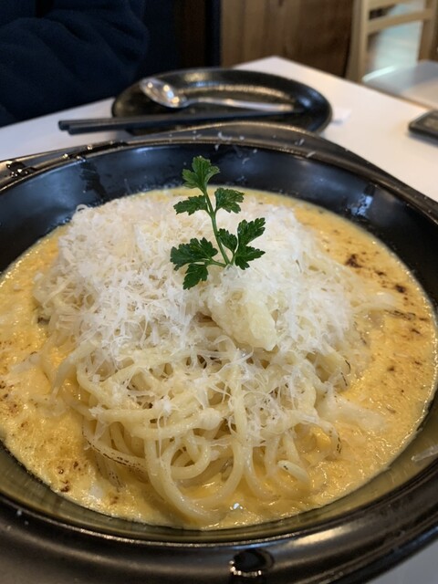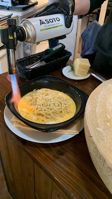 パスタのよろこナーラは目の前でパフォーマンスしてくださり、チーズ大量に削ってくれた!