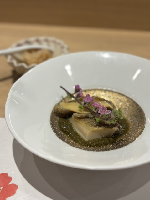 鮑の肉厚やばいっ!そして肝のソースはご飯と混ぜてリゾット風に!