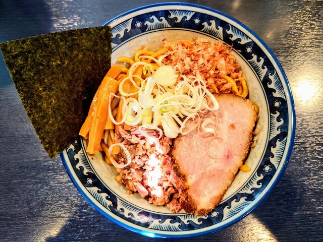 絶妙な茹で加減でもっちもちの極太麺に、ラードの中でも最高級と謳われてる“カメリアラード”ど、うま味たっぷりのたれがベースの油そば。低温調理されたチャーシューと、確りした歯ごたえのメンマ、ネギと海苔が添えられて、仕上げに怒涛の鰹節!圧巻のビジュアル!!ですね。