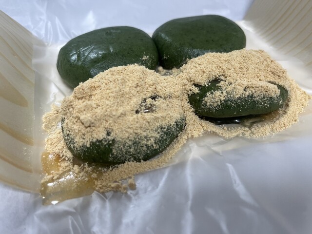 餡無しタイプはまずはそのまま食べてみるとヨモギの香りが鼻を抜ける。香ばしくて味わいのあるきな粉と、澄み切った甘い白蜜をかけるとこれまた至福♪