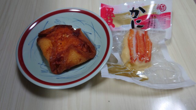 本日のお土産は工場直売店限定パンドーム(ベーコン、チーズ、玉葱入のすり身をパンに包んでさっくり揚げてます)と、ずわい蟹の棒肉を贅沢に載せた玉子すり身のかにかま。