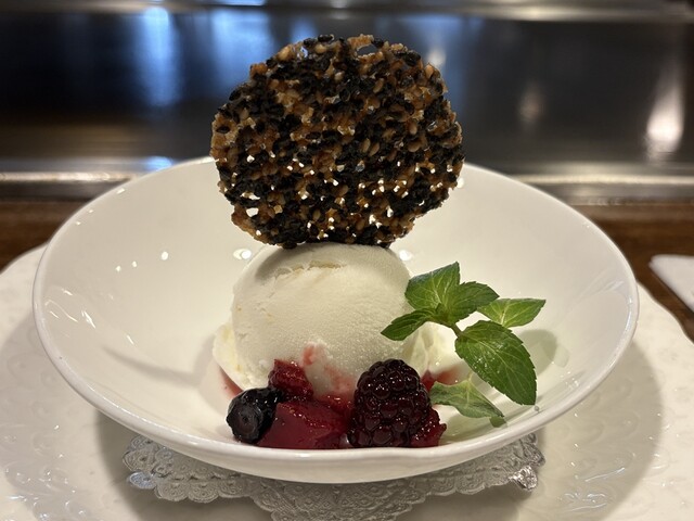 デザートのレモンシャーベットには果肉が混ぜ込まれており満足感がありました。胡麻のチュイールも香ばしくて絶品です。