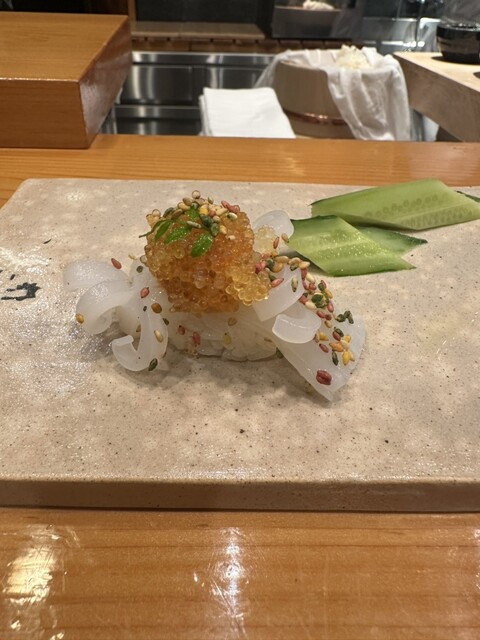 毎回素晴らしいのですが、スペシャリテのイカはもはや芸術品ですね。あれを見たら天寿しと分かる脳みそで記号化されてる作品を生み出していることに改めて感動です。