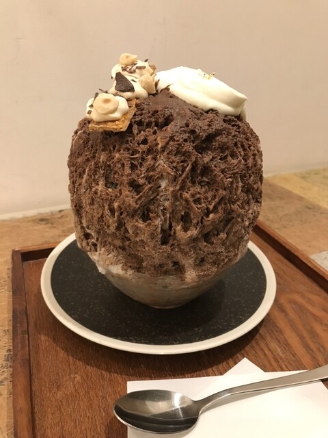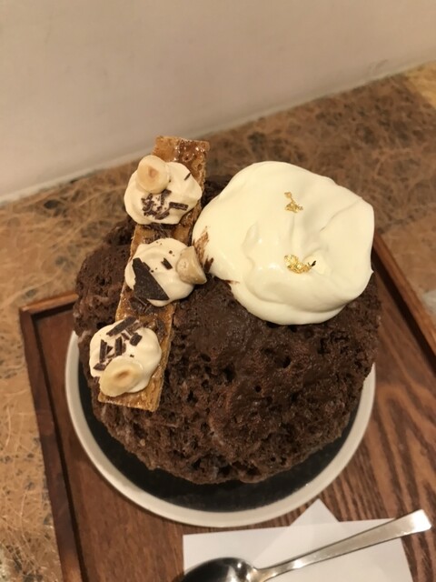 期待以上の味でした。上にはミルクジェラート。チョコとアイス、ほうじ茶のかき氷のバランスが良く、ビックリするほど美味。