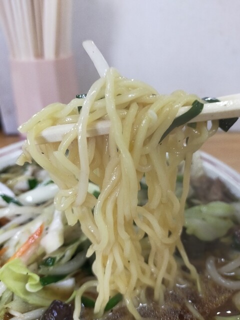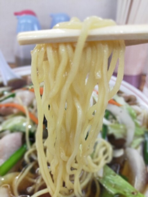 麺はやや縮れている細麺のタイプ。昔ながらの中華そば風です。硬め発注の為か噛むとプツンと切れる感じです。大盛りなので後半でも伸びた感触はありません。ツルツルの食感でのど越しも良いです。美味しいです。