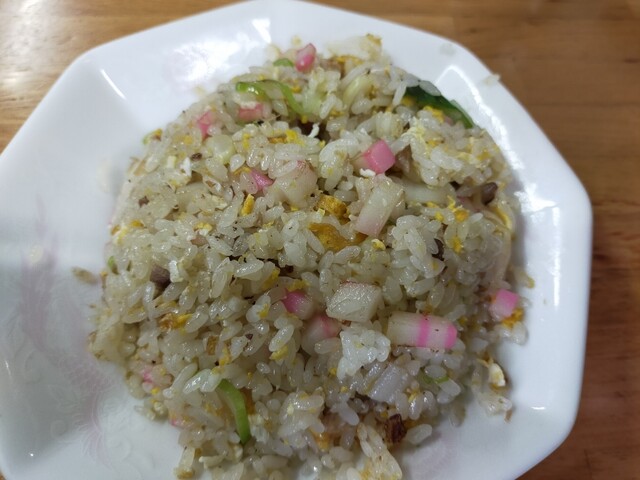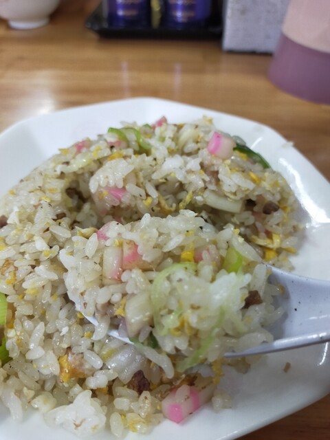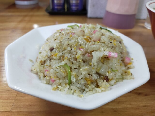 こちらのチャーハンはしっとりでもパラパラでも無く、シトパラ。米粒もしっかりしていて丁度よい塩梅。そして紅白カマボコも入っている。