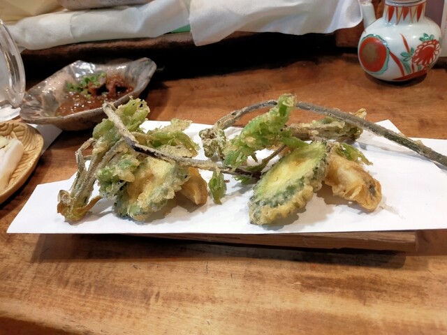 まずは、女将さんから“山菜の天麩羅もりあわせ“をお勧めされたので注文。