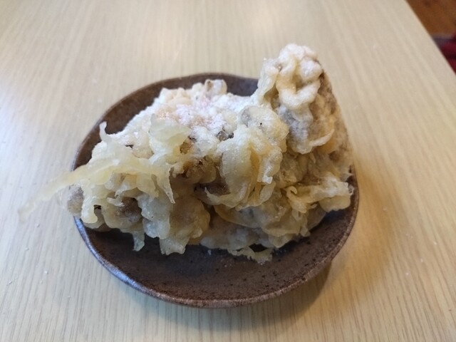 うどんセットをオーダーしましたが、お腹が空いていて写真は舞茸天だけ。セット料金から+50円でしたがしっかりした大きさで、衣の塩梅も良くて納得です。