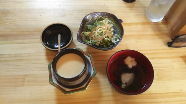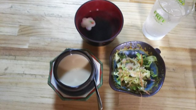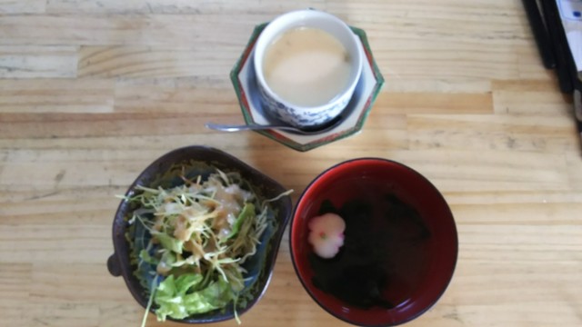サラダ、お吸い物、茶碗蒸しの三点セット。