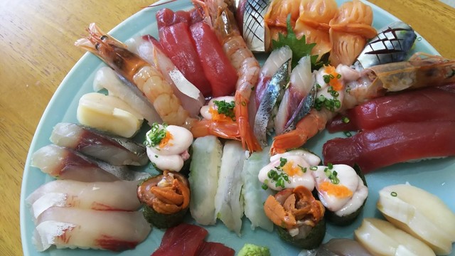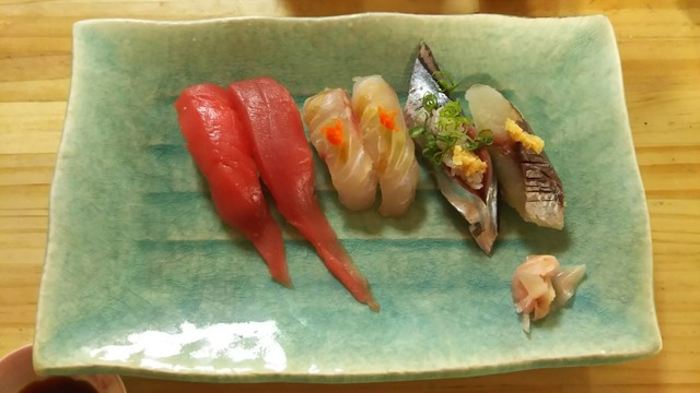 食事物、握り。右から、アジ、サンマ、タイ、 マグロ。