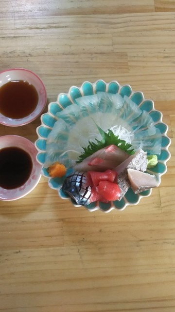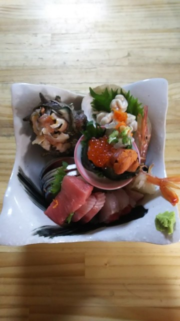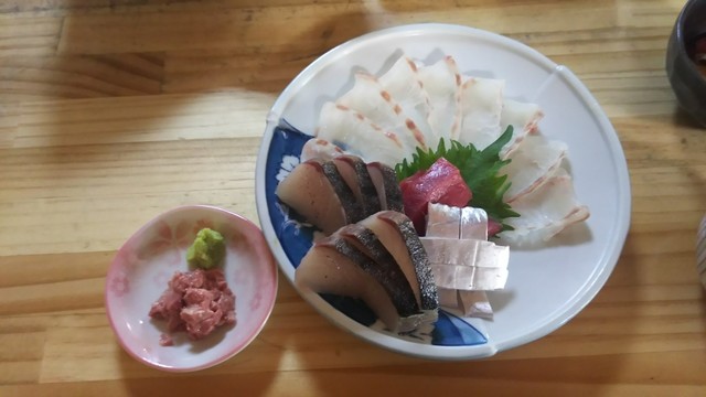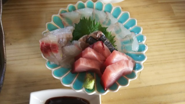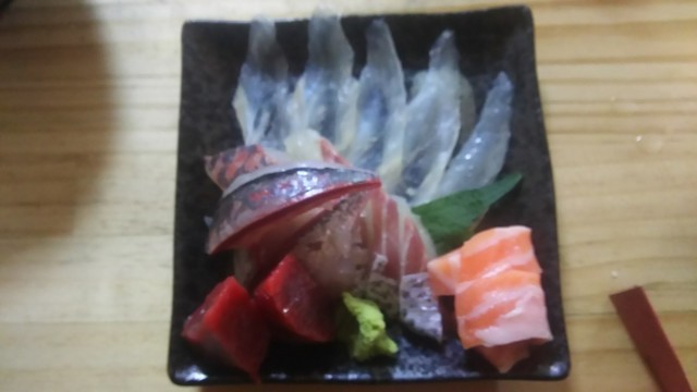 刺身盛り、ヒラメ、タイ、イワシ、サワラのタタキちょっぴりイクラ。