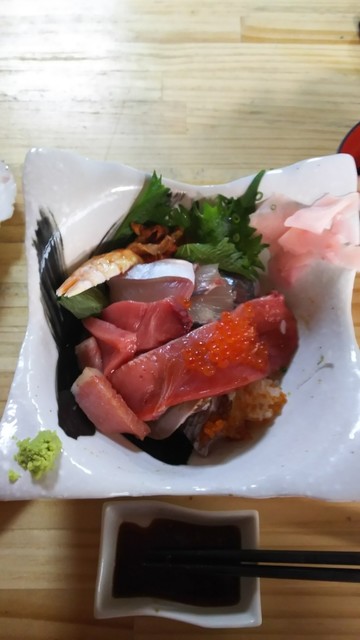 私の場合、黙っていたら、御飯は酢飯が出て来るのですが、皿に乗りきれなかった刺身がのってます。