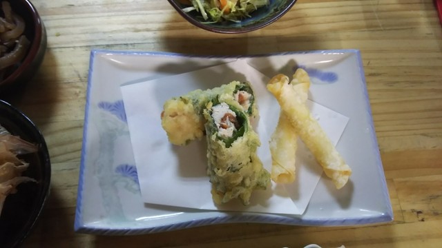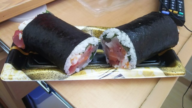食事物、アジ握り、マグロの手巻き寿司、巻きいなり。