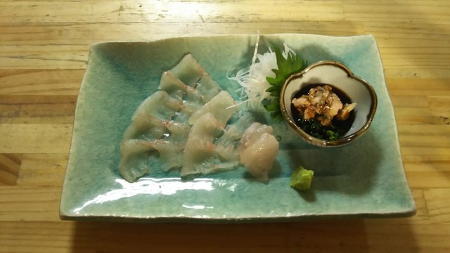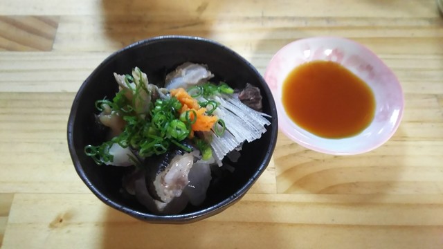 てっさ、河豚皮 。海鮮丼(上)の別皿