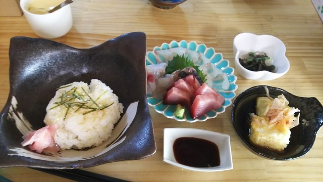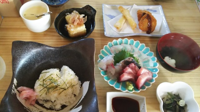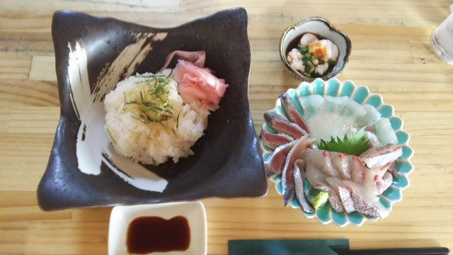 お刺身、アジ、マグロ、金時鯛、サワラのたたき。