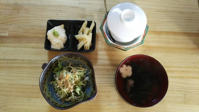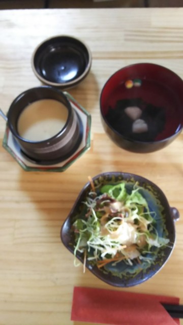 サラダ、お吸い物、茶碗蒸し、小鉢2種。