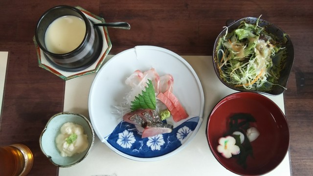右上から時計回りに、サラダ、お吸い物、チーズ豆腐、茶碗蒸し、真ん中に刺身です。
