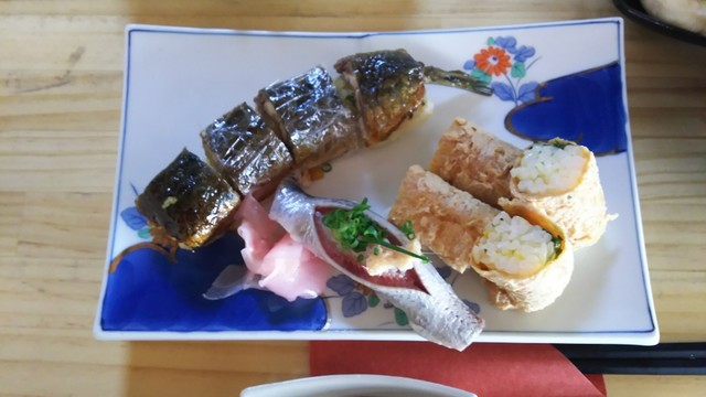 食事物、イワシ蒲焼棒寿司、巻きいなり、イワシ握り。