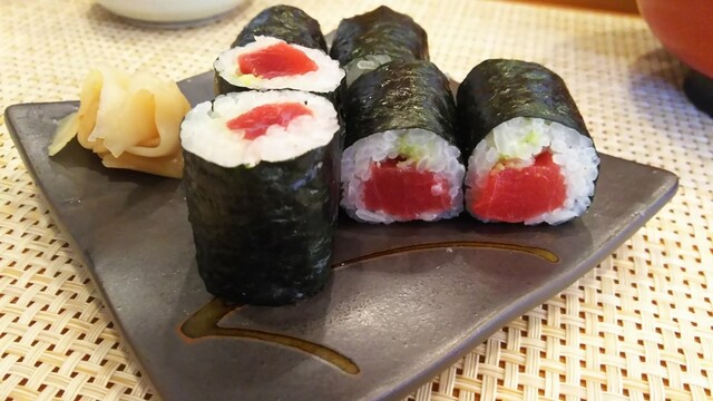 食べ終わる直前、大将が、3種類の巻物が載った皿をサービスして下さいました。
