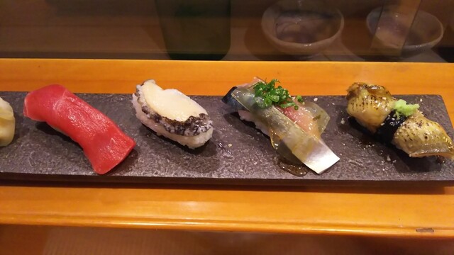 柚子胡椒を使った白身、細かく包丁を入れ、甘味がました気がするイカ、いつもはずさないアナゴ、そして大好きなサバは2貫!