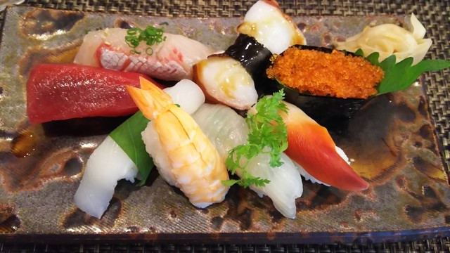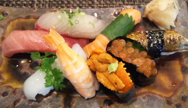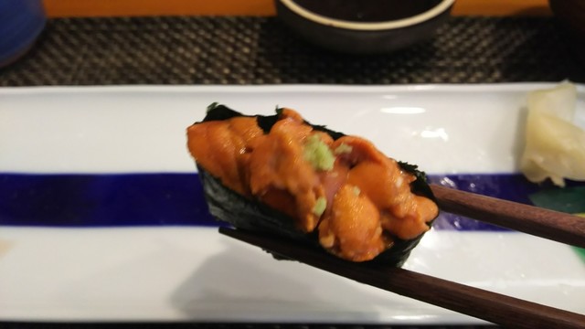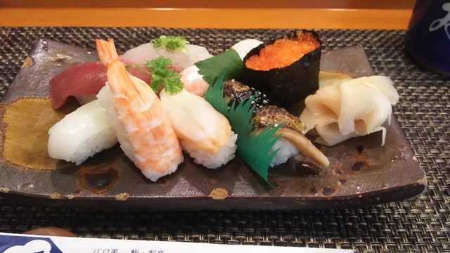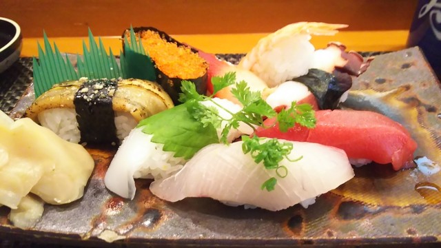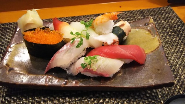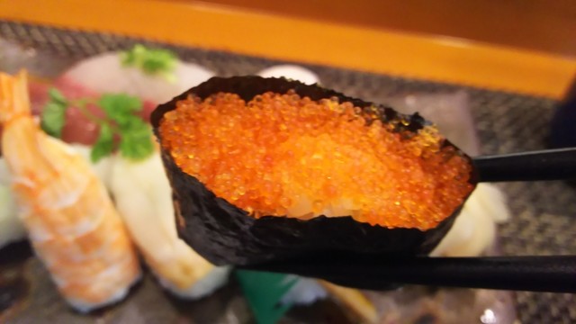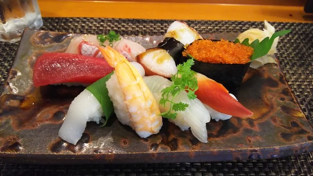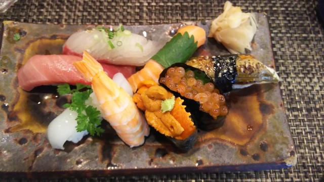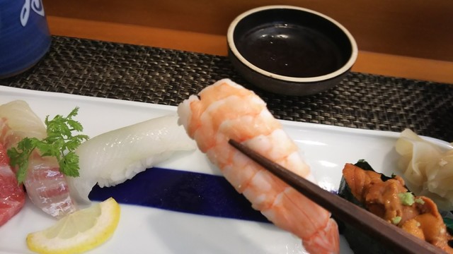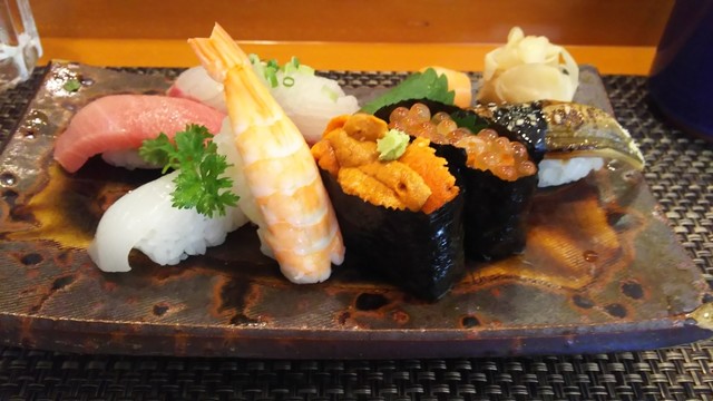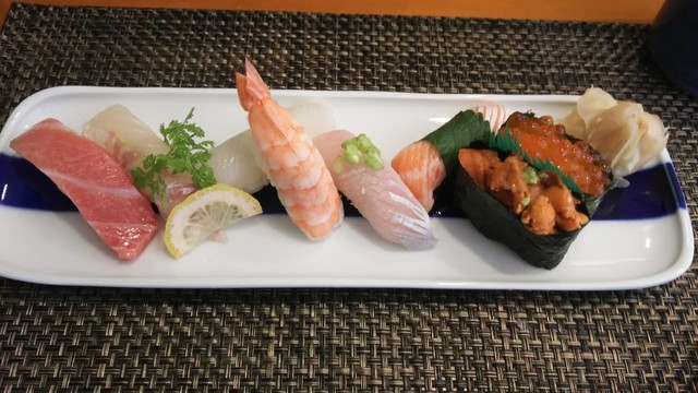 今日のネタは、マグロ、イカ、カンパチ、タイ、エビ、アナゴ、イクラ、ウニです。