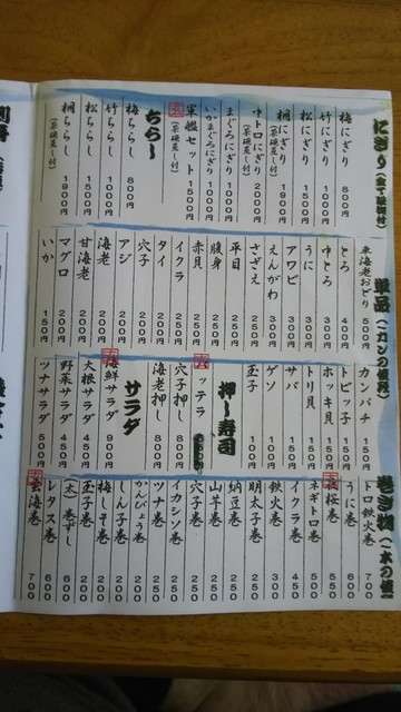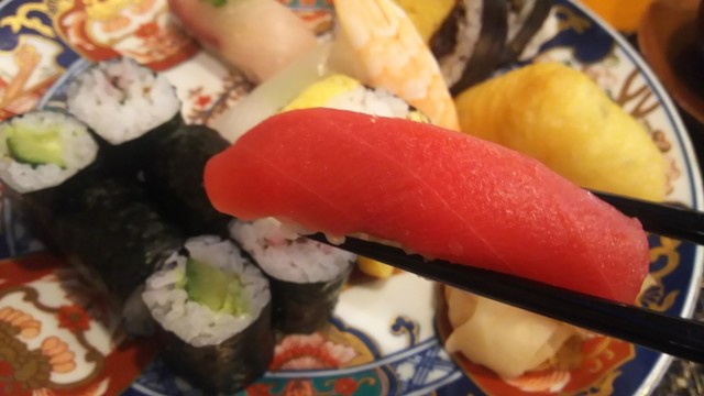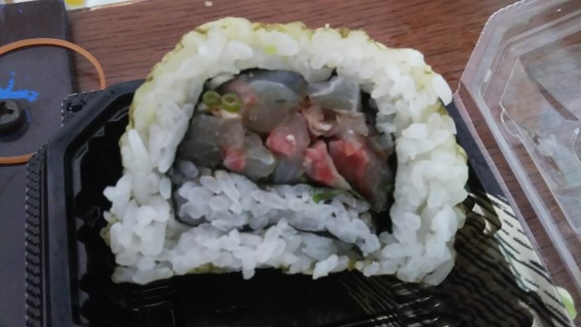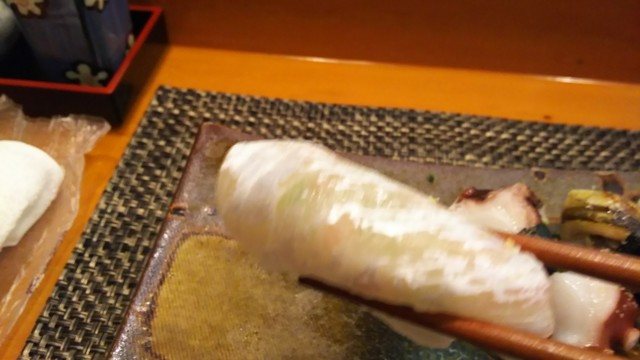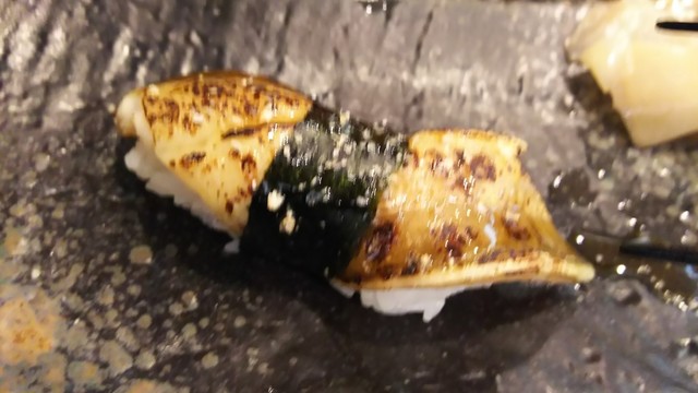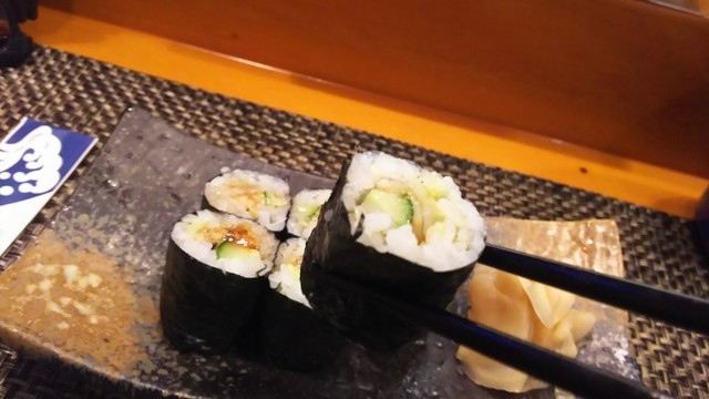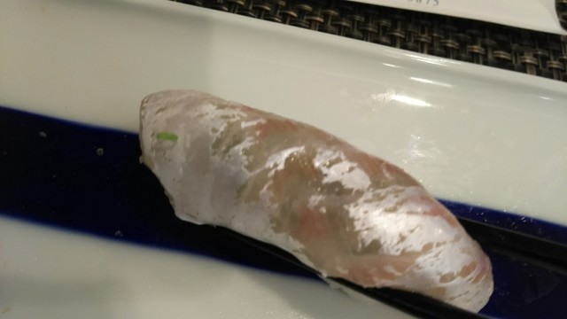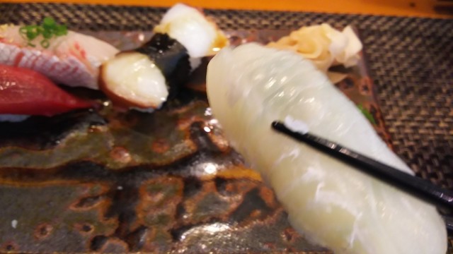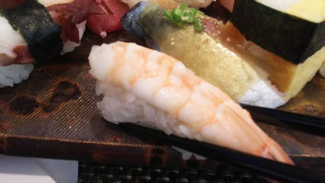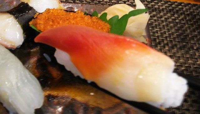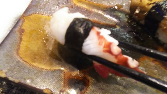 この日のネタは、マグロ、イカ、エビ、タコ、サーモン大葉巻、カンパチ、ホッキ貝、アナゴです。