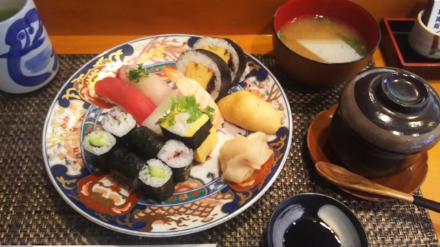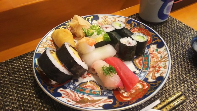 にぎりはマグロ、カンパチ、イカ、エビ、玉子は普通のにぎりではなく博多、細巻きがカッパとシソ巻が3切れずつで1本分、いなり1個に太巻き2切れ、いろいろ楽しめる構成ですねd(⌒ー⌒)!
