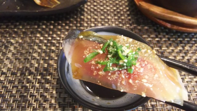 口に入れれば、サバ特有の脂の乗りと、それによる抜群の旨味、軽く〆た食感、100点です。