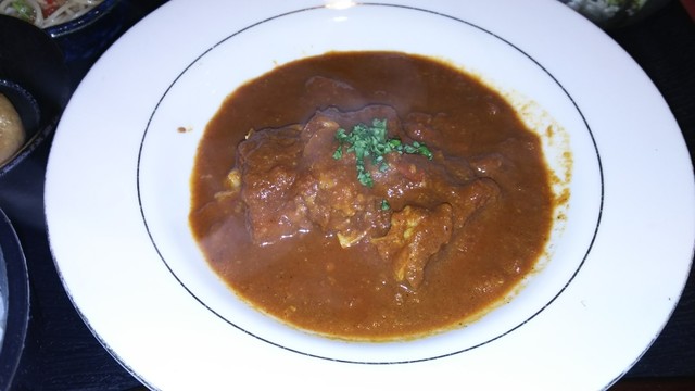 カウンター席について、「角切り豚肉のスパイストマト煮込み」を注文しました。