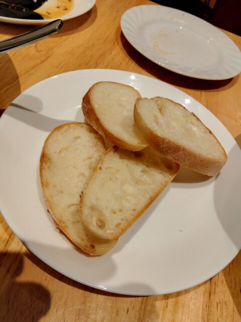 とりあえず、ムール貝とアサリの殻を全部はずして、麺をソースによ〜く絡めてからいただきます。